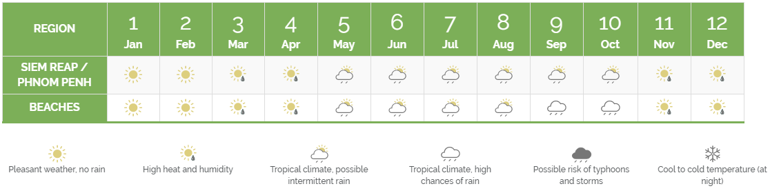 Cambodia is warm year-round. Dry season, running November through May, encompasses two seasons: cool (November-February) and hot (March-May). Cool season is when most travellers visit Cambodia. Wet season runs May through September and is a good time to visit Angkor